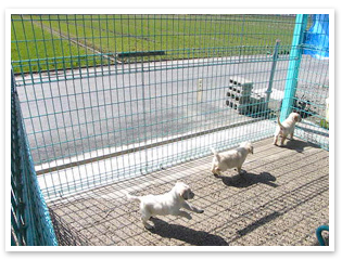 屋外に設けたドッグランにて、 日光浴と運動をするワンちゃん達。